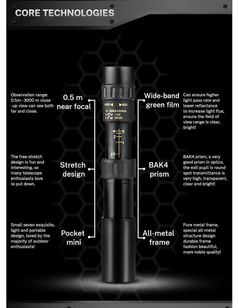 Telescope *1Nylon waterproof telescope bag *1Mobile phone holder *1Tripod *1Lens wiping cloth *1Portable rope *1