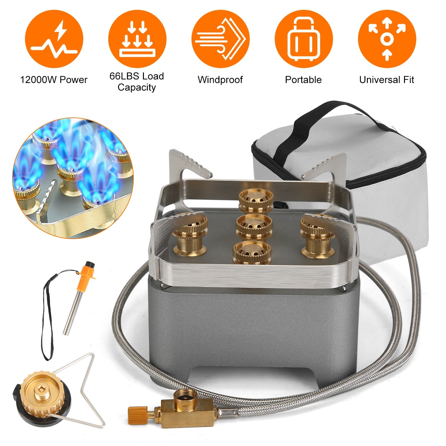 - *Compact,Lightweight & Portable*: Weighing only 1.54lbs,this compact and lightweight is convenient and portable for on-the-go cooking. Come with a nice carrying bag,allow you to neatly organize all the accessories in it,including gas pipe,igniter,adapter,wrench.
