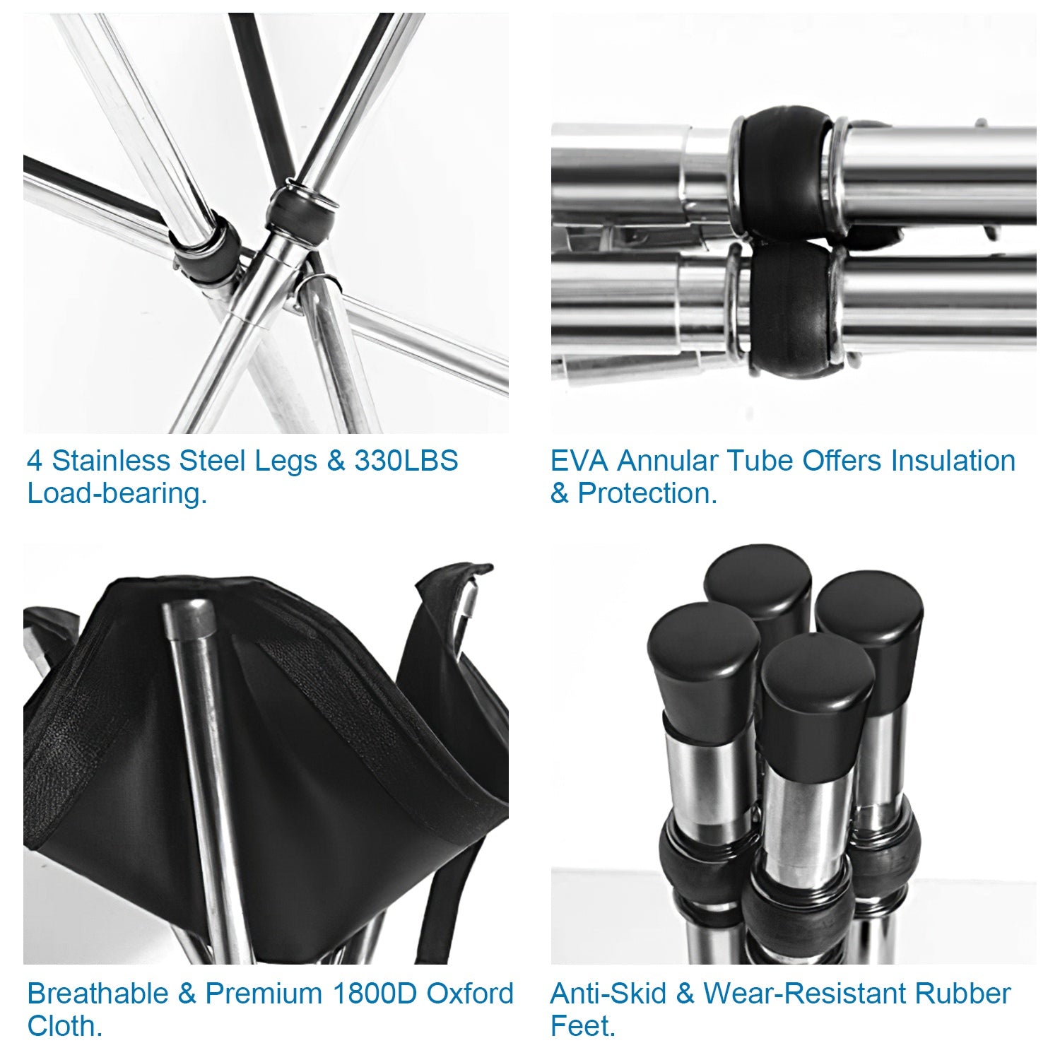 - *330LBS Load*: Four-legged design can provide better support. Made of great rubber feet covers and thicker chair surface,offers our camping stool outstanding skid resistance and up to 330lbs load-bearing capacity.