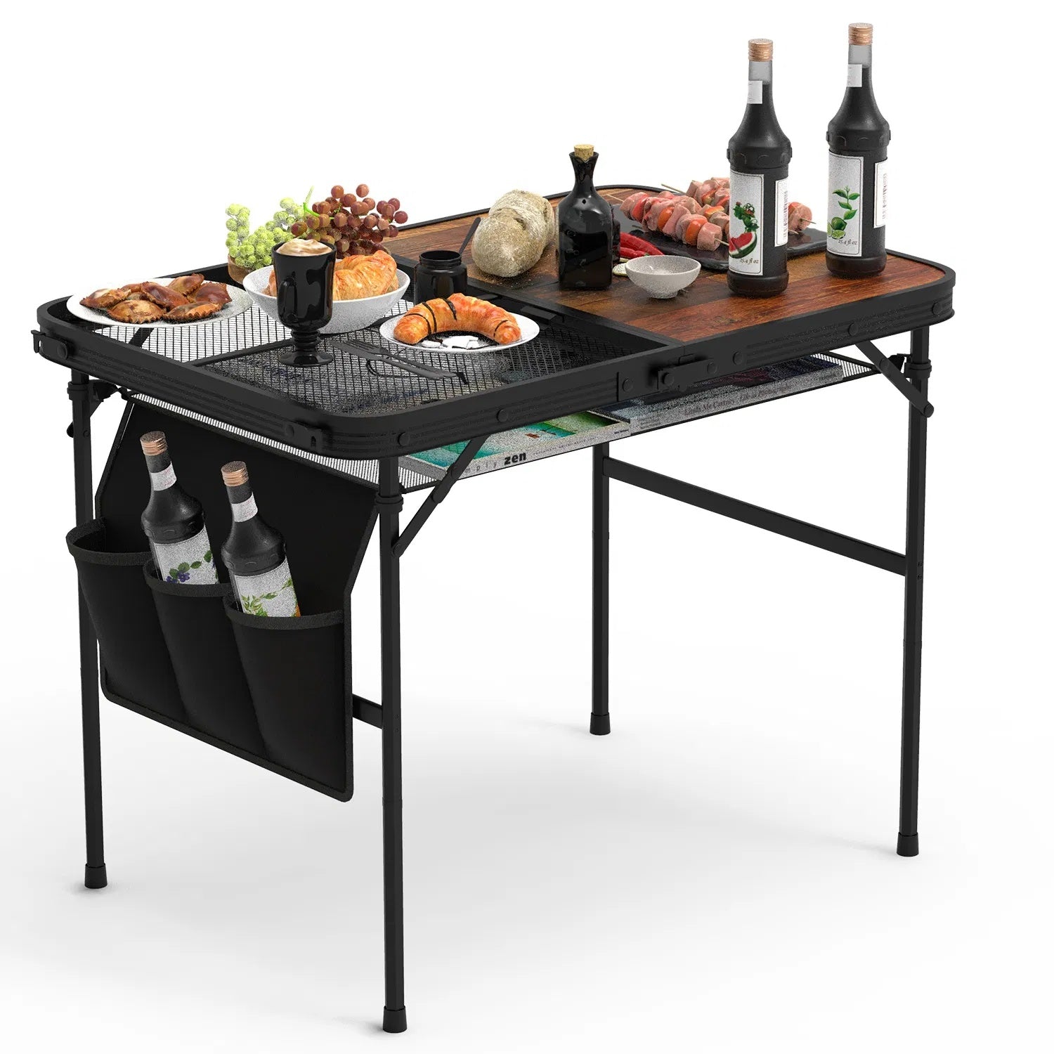 Hanging Storage Net: Comes with a hanging net with 3 side pockets, just clip it on 4 poles under the table to hold your snacks, keys, books, beverage, water bottles, drinks, etc.. Ideal for camping, travel, BBQ, hiking, fishing, outdoor RVs, picnics and backyards.