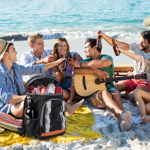 ★★★★★This multi-pocket cooler backpack combined with a main compartment, a top mesh pocket, a front zipper pocket, 2 side mesh pockets, front elastic rope, 8 nylon strap holes, a bottle opener, an elastic strap on the shoulder strap, has 25L/6.6Gal capacity in total, able to hold up to 36Can(350ml), perfect to keep your beer, fruits and food cold/ hot/ fresh about 4-5 hours. The shoulder strap with mesh pads help to relieve shoulder pressure during outside activities. Perfect for hiking, camping, picnic, travel, etc..