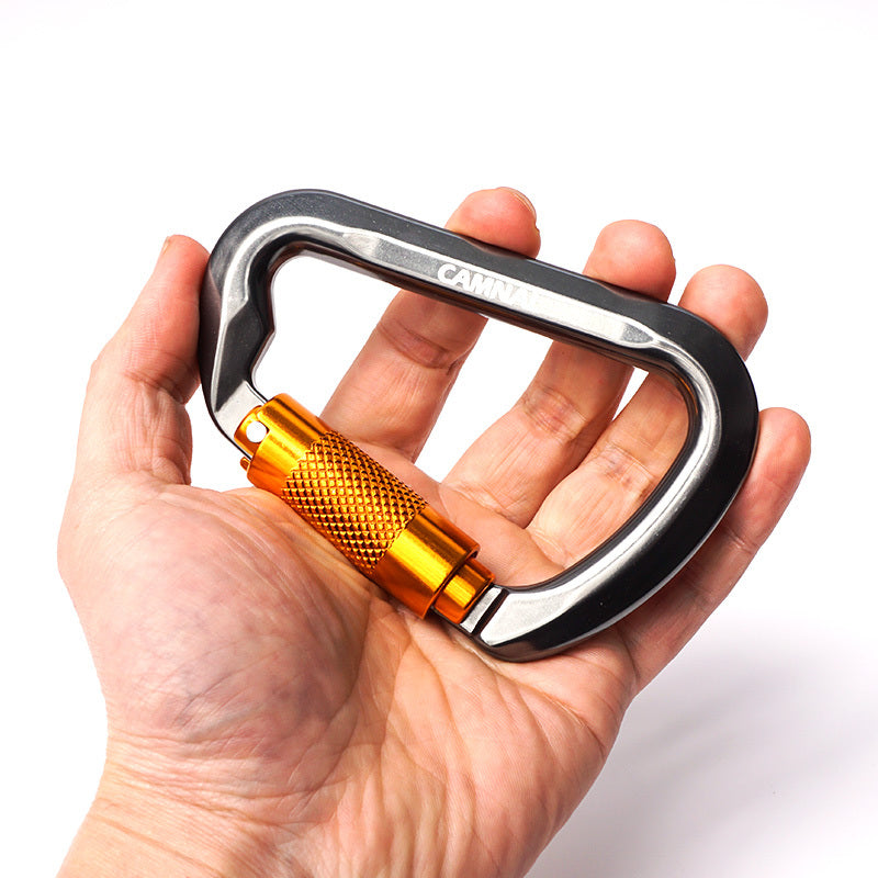 Name: D-type automatic main lock Weight: 90g Material: Hot Forging Aluminum Magnesium Alloy Color: grey Tensile force: 25kn Opening: 23mm