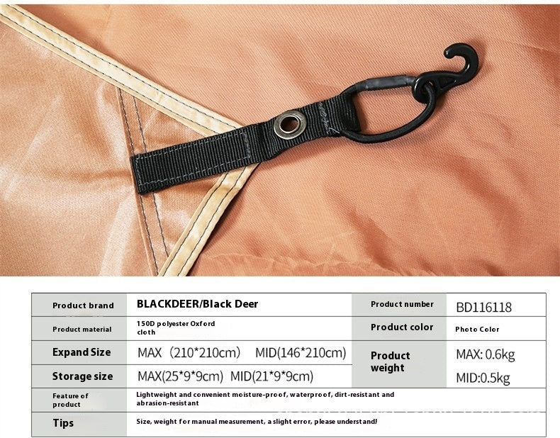 Product material: 150D polyester Oxford cloth Unfolded size: MAX (210 * 210cm) MID (146 * 210cm) Storage size: MAX (25 * 9 * 9cm) MID (21 * 9 * 9cm) Product features: Lightweight, convenient, moisture-proof, waterproof, dirt resistant, and wear-resistant